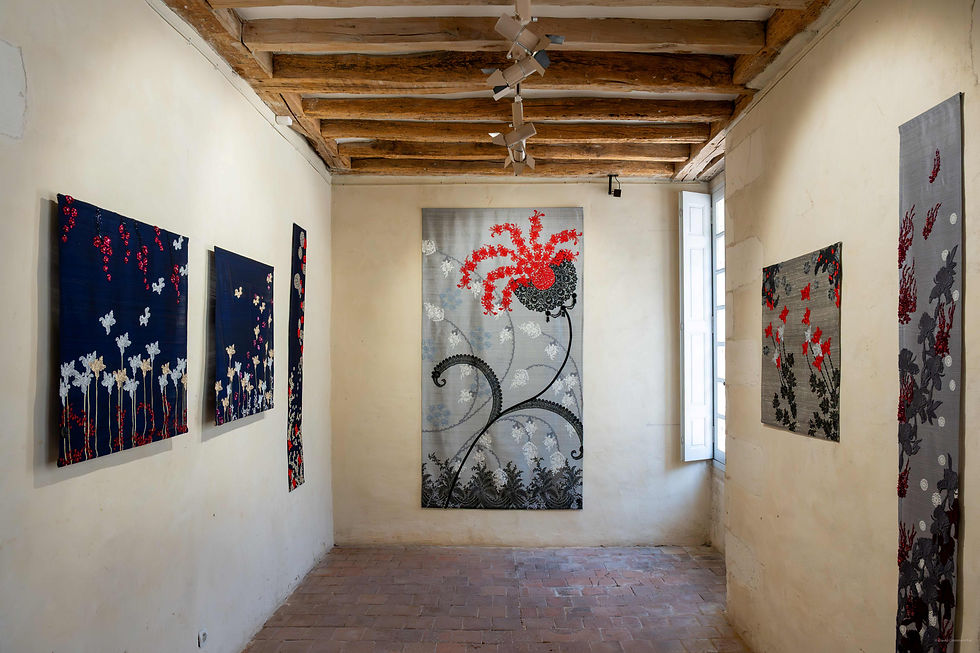 La première salle présente le « chœur des 12 iris », la deuxième salle permet de découvrir d’autres univers floraux et de jouer sur des fonds de soie aux coloris très contrastés. La salle d’accueil présente d’autres thèmes de travail.